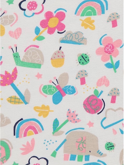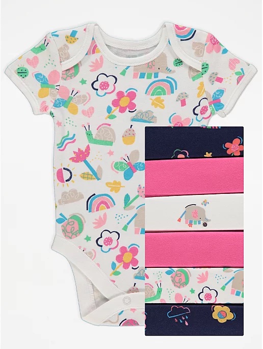 • 7 pack • Crew neck • Envelope shoulder • Short sleeve • Animal/floral/rainbow designs • Press stud fastening • Soft jersey fabric